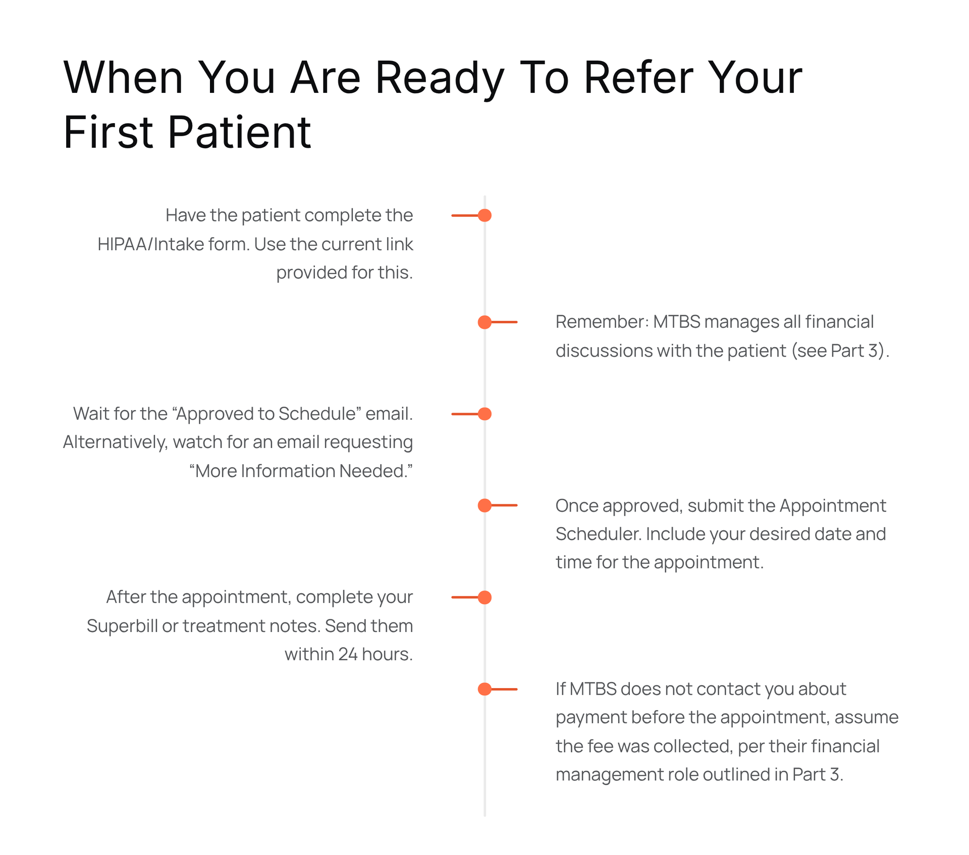 Learn how to move from onboarding to your first insured patient, including how to refer to MTBS, where to find forms, what to submit within 24 hours, how to reach Provider Navigators, and what timelines to expect.